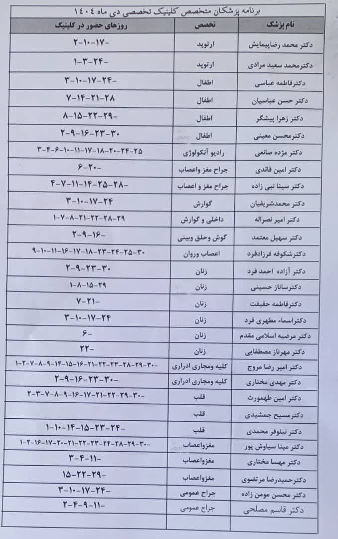 برنامه حضور پزشکان متخصص درمانگاه فاطمه زهرا (س) بیمارستان ولیعصر (عج) شهرستان کازرون