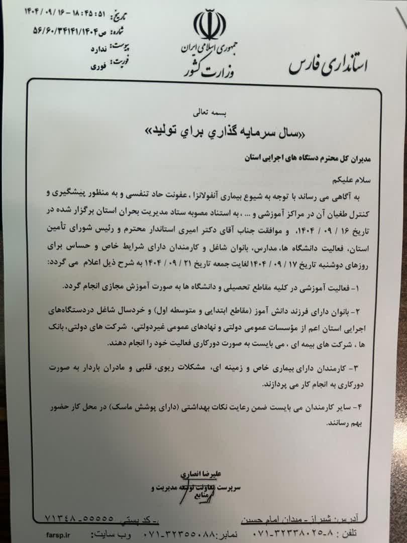 سرپرست معاونت توسعه مدیریت و منابع استانداری فارس طی نامهای فعالیت مدارس و دانشگاههای استان را تا پایان هفته بهصورت مجازی و فعالیت بانوان شاغل دارای فرزند محصل در دستگاههای اجرایی استان را بهصورت دورکار اعلام کرد.