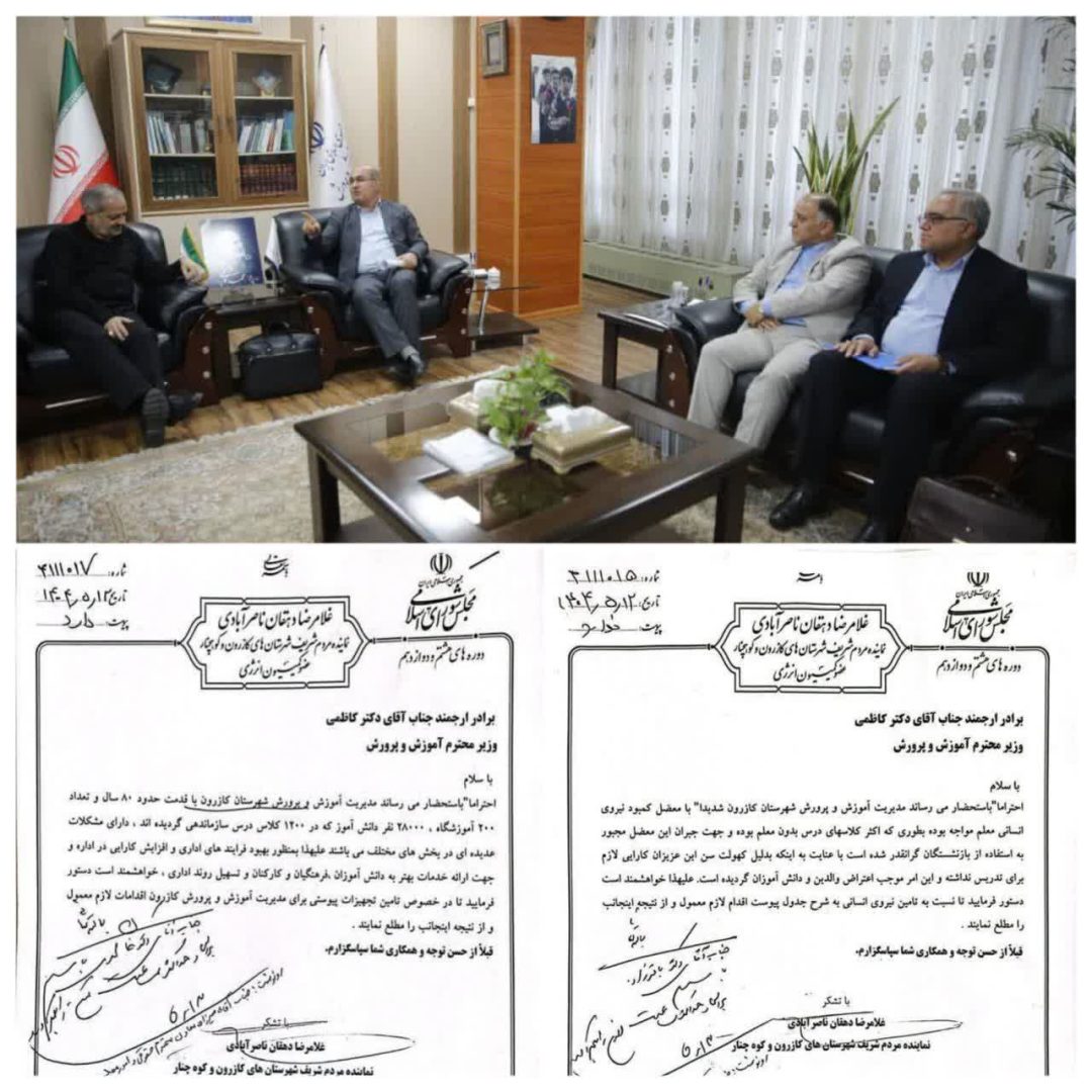 به گزارش کازرون نگاه جلسه‌ای با حضور علیرضا کاظمی وزیر آموزش و پرورش، دهقان ناصر آبادی نماینده شهرستان کازرون، امیر حسین جمشیدی رئیس آموزش و پرورش، با هدف پیگیری مطالبات و کمبودهای آموزشی شهرستان‌های کازرون و کوه‌چنار برگزار شد.